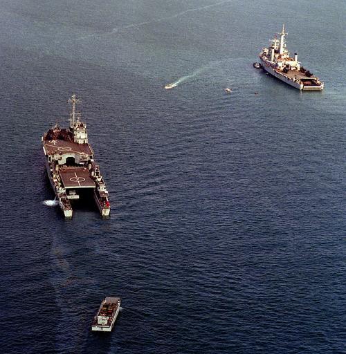 Keywords: Ouragan HMS-Intrepid DN-SC-90-08862c.jpg The French landing ship dock Ouragan L9021 left its stern gate open for landing craft operations and the Royal Navy amphibious transport dock HMS Intrepid L11 sitting offshore during the NATO southern region exercise DRAGON HAMMER '90 on 3 May 1990 U S Defenseimagery mil photo VIRIN DN-SC-90-08862 http //www dodmedia osd mil/Assets/1990/Navy/DN-SC-90-08862 JPG 1990-05-03 photographer's name PH1 AW Raymond H Turner II USN resized and croped hi-res picture PD-USGov International groups of naval ships HMS Intrepid L11 Ouragan L9021 Stern gates Dragon-Hammer90 |