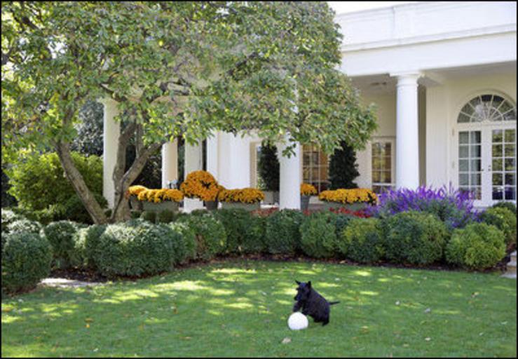 | Keywords: Oval Office view from Rose Garden.jpg Barney plays just outside the Ovale Office under the Saucer magnolia tree in the Rose Garden Barney le scottish terrier de la famille Bush joue sous le magnolia de Chine de la Roseraie de la Maison Blanche devant le bureau ovale les 3 fenêtres à gauche un peu masquées White House http //georgewbush-whitehouse archives gov/history/grounds/garden/photoessays/fall2006/02 html White House Kimberlee Hewitt autumn 2006 PD-USGov Outside of the Oval Office White House Rose Garden 20061000 Barney dog Animals in the White House Magnolia × soulangeana Dogs on grass Playing dogs |