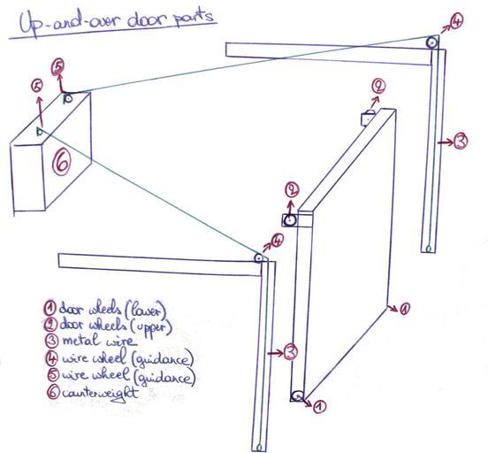 | Keywords: Overhead door components.JPG en A schematic of the construction of an overhead door Note that the 2 rails are completely seperate the door wheels cannot move from rail 1 to rail 2 The upper wheels connect to the horizontal rails and the lower ones connect to the vertical rails Also not that in this design the counterweight connects to 2 seperate metal wires wich are each connected to the lower wheels not the upper wheels The schematic was made by simply analysing KVDP's current home garage door and drawing it over own KVDP 2010-03-22 Doors Type of gate |