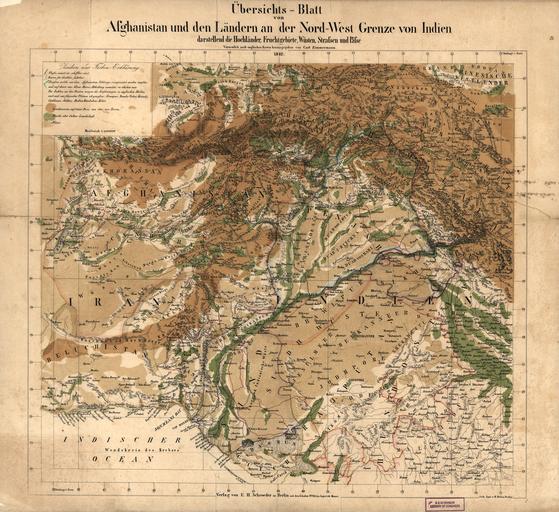 | Keywords: Overview of Afghanistan and the Countries on the Northwest Border of India WDL217.png Artwork ru Цимме манн Ка л fr Zimmermann Carl en Zimmermann Carl zh 齐默尔曼 卡尔 pt Zimmermann Carl ar زيمرمان كارل es Zimmermann Carl ru Обзо Афганистана и ст ан на севе о-западной г анице Индии fr Vue d'ensemble de l'Afghanistan et des pays frontaliers du Nord-Ouest de l'Inde en Overview of Afghanistan and the Countries on the Northwest Border of India zh 阿富汗以及印度西北边境上的国家综述 pt Visão geral do Afeganistão e dos países na fronteira noroeste da Índia ar نظرة شاملة لأفغانستان والبلدان على الحدود الشمالية الغربية من الهند ru Ка л Цимме ман был пе вым лейтенантом п усской а мии кото ый в начале 1840-х годов глубоко заинте есовался как с личной так и с п офессиональной точки з ения военными действиями кото ые б итанская а мия в то в емя вела в Афганистане В войне позднее названной Пе вой англо-афганской войной 1839-40 гг целью Великоб итании было асп ост анить свое влияние от севе о-западной Индии до Афганистана однако б итанские войска поте пели яд сок ушительных по ажений со сто оны афганских племен и в конце концов были вынуждены отступить В 1842 году Цимме манн опубликовал <i> Der Kriegs-Schauplatz in Inner-Asien </i> Теат военных действий в Цент альной Азии книгу в кото ой для немецкой аудито ии излагались геог афические сведения накопленные б итанцами об Афганистане и п илегающий те ито иях В основу этой ка ты Цимме манна легли английские источники в частности П имечания к ка те Афганистана ко олевского геог афа Джеймса Уилда и Схематичную ка ту Афганистана и ст ан г аничащих с Индией на севе о-западе геог афа Ист-Индской компании Джона Уолке а fr Carl Zimmermann était premier lieutenant dans l'armée prussienne Au début des années 1840 il développa un intêret personnel et professionnel prononcé pour le conflit que l'armée britannique menait en Afghanistan Au cours de ce qu'on connait sous le nom de première guerre anglo-afghane 1839-1840 la Grande-Bretagne tenta d'étendre son contrôle au nord-ouest de l'Inde jusqu'en Afghanistan mais subit une série de défaites désastreuses face aux tribus afghanes avant d'être forcée de se retirer En 1842 Zimmermann publia <i>Der Kriegs-Schauplatz in Inner-Asien</i> Le théâtre de guerre en Asie intérieure un livre dans lequel il essayait d'apporter au public allemand les connaissances géographiques que les Britanniques avaient accumulées sur l'Afghanistan et sa région Zimmermann a créé cette carte sur la base de sources anglaises en particulier les ouvrages Notes to a Map of Afghanistan Notes sur une carte d'Afghanistan de James Wyld géographe auprès de la reine et Skeleton Map of Afghanistan and the Countries on the North-West-Frontier of India Carte squelette de l'Afghanistan et d'autres pays de la frontière du nord-ouest de l'Inde de John Walker géographe à la Compagnie des Indes orientales en Carl Zimmermann was a first lieutenant in the Prussian Army who in the early 1840s developed a strong personal and professional interest in the conflict then being waged by the British Army in Afghanistan In what became known as the First Anglo-Afghan War 1839-40 Britain tried to extend its control from India northwest into Afghanistan but suffered a series of disastrous defeats at the hands of the Afghan tribes and eventually was forced to withdraw In 1842 Zimmermann published <i>Der Kriegs-Schauplatz in Inner-Asien</i> The theater of war in inner Asia a book in which he attempted to bring the geographic knowledge that the British had accumulated about Afghanistan and its environs to a German audience Zimmermann based this map on English sources in particular Geographer to the Queen James Wyld's Notes to a Map of Afghanistan and East-India Company geographer John Walker's Skeleton Map of Afghanistan and the Countries on the North-West-Frontier of India zh 卡尔·齐默尔曼是普鲁士军队的 个中尉,早 19 世纪40 年代 ,他就对战争冲突 浓厚的个人与专业兴趣,随后被 阿富汗的英军雇用 著名的第 次盎格鲁阿富汗战争(1839-1840 年)中,英国试图将其势力从印度西北部扩张到阿富汗,但遭受了阿富汗部落发动的 系列重创, 终被迫撤军 1842 年,齐默尔曼出版了 <i> Der Kriegs-Schauplatz in Inner-Asien </i> ( 内陆亚洲的战 ),书中 试图让德国读 了解英国积累的 关阿富汗及其周边 区的 理知识 齐默尔曼这幅 图是以英文原始资料为基 ,特别是 理学家奎恩·詹姆斯·威尔德的 阿富汗 图注释 以及 印度公司 理学家约翰·沃克的 阿富汗以及印度西北边境国家的略图 pt Carl Zimmermann foi o primeiro tenente do Exército Prusso que no início de 1840 desenvolveu um interesse pessoal e profissional muito forte sobre o conflito que se envolveu o Exército Britânico no Afeganistão No que se tornou conhecido como a Primeira Guerra Anglo-Afgã 1839-1940 os Britânicos tentaram ampliar seu controle do noroeste da Índia até o Afeganistão mas sofrera