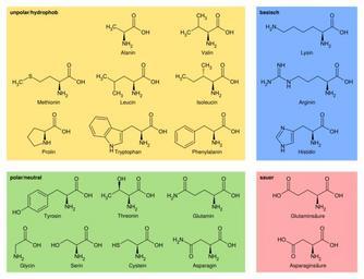 | Keywords: Overview proteinogenic amino acids-DE.svg à bersicht der 20 proteinogenen Aminosäuren nach Eigenschaften gruppiert Overview of the 20 proteinogenic amino acids grouped by properties Own 2010-03-8 Sponk <span class signature-talk >talk</span> PD-chem File Aminosaeuren png File Molecular structures of the 21 proteinogenic amino acids svg Translation possible Proteinogenic amino acids | ||||