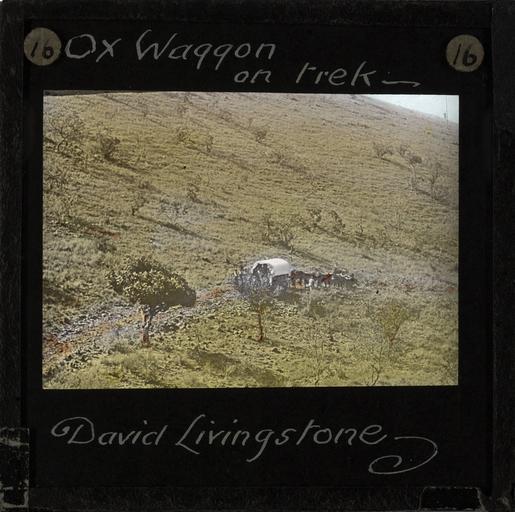 Keywords: Ox-wagon, ca.1875-ca.1940 (imp-cswc-GB-237-CSWC47-LS16-016).jpg en <br> Ox-wagon ca 1875-ca 1940 Photograph of an ox-wagon similar to the type that would have been used as transport by the Scottish missionary David Livingstone The wagon can be seen in the distance trekking across a hillside The wagon is being driven by a number of oxen or cattle ; This belongs to a series of Church of Scotland Foreign Missions Committee lantern slides relating to David Livingstone 1813-1873 the Scottish missionary who was best known as an explorer of Africa and anti-slavery campaigner Livingstone was born in Blantyre Scotland and after working in the local cotton mill from the age of 10 he went on to study medicine and theology in Glasgow in 1836 Having decided to become a missionary he was posted to southern Africa in 1841 In 1845 he married Mary Moffat During his life Livingstone carried out exploration of southern eastern and central Africa he discovered and named the Victoria Falls and it was his meeting with H M Stanley during a search for the source of the Nile that gave rise to the popular quotation Dr Livingstone I presume David Livingstone died in Africa on 1 May 1873 and his body was buried in Westminster Abbey Photographer Unknown Subject personal name Livingstone David 1813-1873 Filename imp-cswc-GB-237-CSWC47-LS16-016 tif Coverage date circa 1875/1940 Part of collection International Mission Photography Archive ca 1860-ca 1960 Type images Part of subcollection Photographs from the Centre for the Study of World Christianity University of Edinburgh U K ca 1900-ca 1940s Repository name Centre for the Study of World Christianity Archival file impaunpub_Volume7/1849 url Repository address The University of Edinburgh School of Divinity New College Mound Place Edinburgh EH1 2LX United Kingdom Geographic subject country Scotland Format aacr2 1 lantern slide 8 x 8 cm Geographic subject continent Europe Rights Contact the repository for details Part of series David Livingstone LS16 Repository email divinity-CSWC ed ac uk Subject lcsh Keyword Transportation; Livestock Date created circa 1875/1940 Publisher of the digital version University of Southern California Libraries Subject aat genre distant views Format aat lantern slides Legacy record ID impa-m69429 Access conditions http //www ed ac uk/schools-departments/divinity/research/centres/world-christianity/collections-resources File GB 237 CSWC47/LS16/16 circa 1875 /1940 author http //digitallibrary usc edu/cdm/ref/collection/p15799coll123/id/64965 PD-old-70-1923 Images from USC Digital Library uploaded by Fæ International Mission Photography Archive ca 1860-ca 1960 Ox-drawn wagons in South Africa Lantern slides of South Africa Magic lantern images