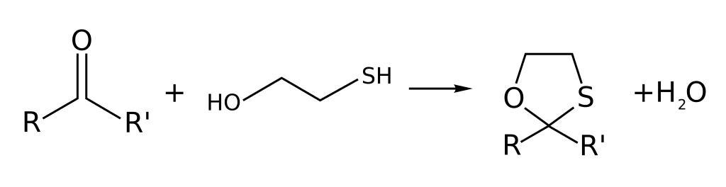 Keywords: Oxathiolane-formation-with-2-mercaptoethanol-2D-skeletal.svg Redrawn from scratch with inkscape Addition reactions Oxathiolanes