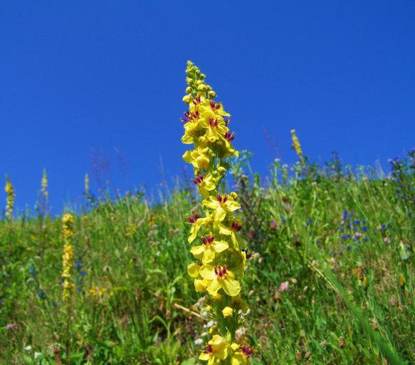 Keywords: oxtail weed yellow wild flowers colorful meadow blue sky