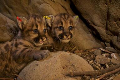 Keywords: 5kd mountainlion p50 p51 p52 p39 National Park Service researchers discovered two litters of mountain lion kittens in the eastern Santa Susana Mountains in June 2016. A total of five kittens, three females and two males, were eartagged and returned to their respective dens earlier this month. P-50 (male), P-51 (female), and P-52 (male) were born to P-39. P-52 is on the left and P-50 is on the right. P-38 is suspected to be the father. National Park Service researchers discovered two litters of mountain lion kittens in the eastern Santa Susana Mountains in June 2016. A total of five kittens, three females and two males, were eartagged and returned to their respective dens earlier this month. P-50 (male), P-51 (female), and P-52 (male) were born to P-39. P-52 is on the left and P-50 is on the right. P-38 is suspected to be the father.