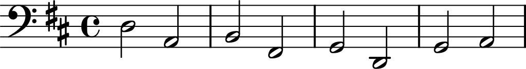 | Keywords: Pachelbel Canon bass line.svg The bass line of Pachelbel's Canon in D Created by bdesham with GNU LilyPond <br> v 2007-08-31 PD-old <gallery>Image Pachelbel Canon bass line png raster version Image Pachelbel Canon bass line quarter notes svg same thing with quarter notes</gallery> LilyPond source <pre> \version 2 10 15 tune \relative c \clef bass \key d \major \time 4/4 d2 a b fis g2 d g a \score \new Staff \tune \layout ragged-right t </pre> Compositions by Johann Pachelbel Sheet music examples Images with LilyPond source code |