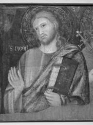 | Keywords: Pacino di Bonaguida - Madonna and Child with Saints - Walters 372494 - Detail C.jpg For more information on this dossal altarpiece please see Zeri catalogue number 3 pp 6-7 between 1323 1327 Medieval tempera on wood silver fir Painted surface H at left and right sides 18 7/8 x W 62 11/16 x D 11/16 in 47 9 x 159 2 x 1 8 cm ; Painted surface H at central gable cm 62 2 accession number 37 2494 16467 Private collection Ireland Justice James A Murnaghan Dublin ca 1930 Dr Francis Murnaghan Fund 1973 mode of acquisition unknown Walters Art Museum Gift of the Dr Francis D Murnaghan Fund 1973 Transcription The name of each saint left to right S NCOLAUS; S LAURETI; S IACOP; S FRCISC God's Minstrel St Francis of Assisi The Walters Art Gallery Baltimore 1982 Illuminated Manuscripts Masterpieces in Miniature The Walters Art Gallery Baltimore 1984-1985 place of origin Florence Italy Walters Art Museum license 2D Medieval art in the Walters Art Museum Pacino Di Bonaguida Paintings in the Walters Art Museum Media contributed by the Walters Art Museum needs category review |