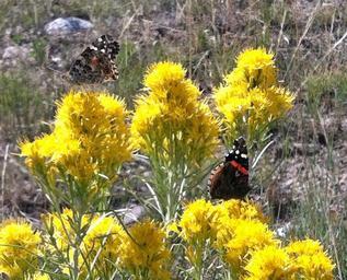 | Keywords: outdoor flower plant A painted lady butterfly (left) and a red admiral (right) seek nourishing nectar from golden yellow rabbitbrush (Ericameria species); Katy Duffy; September 2014; Catalog #19513d A painted lady butterfly (left) and a red admiral (right) seek nourishing nectar from golden yellow rabbitbrush (Ericameria species); Katy Duffy; September 2014; Catalog #19513d | ||||