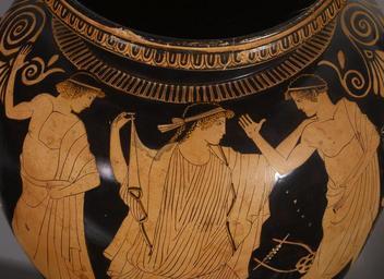 Keywords: Painter of the Florence Stamnoi - Red-figure Stamnos with Eos and Two Youths - Walters 482034 - Detail A.jpg His lyre tumbling to the ground the youth Cephalus flees the amorous goddess Eos She grabs his neck while fingering her mantle in the traditional gesture of a demure bride This theme was a popular subject for red-figure vessels from the early to mid 5th century BC This stamnos wine container belongs to a class of vessels which has a low foot in the form of a ring There are seven known stamnoi of this type All have the same size and proportions and were probably fashioned by the same potter between 470 460 BC Classical terracotta cm 36 3 19 3 accession number 48 2034 35108 Robert Garrett Collection date and mode of acquisition unknown Walters Art Museum 1951 by purchase Museum purchase 1951 Translation KALOS Pandora's Box Women in Classical Greece The Walters Art Gallery Baltimore; Dallas Museum of Art Dallas; Antikenmuseum Basel und Sammlung Ludwig Basel 1995-1996 Déjà Vu Recurrence The Walters Art Museum Baltimore 2007-2008 Heroes Mortals and Myths in Ancient Greece The Walters Art Museum Baltimore; Frist Center for the Visual Arts Nashville; San Diego Museum Of Art San Diego; Alexander S Onassis Public Benefit Foundation USA New York 2009-2011 place of origin Athens Greece Walters Art Museum license Ancient Greek red-figure pottery in the Walters Art Museum Painter of the Florence Stamnoi Media contributed by the Walters Art Museum needs category review Kalos inscriptions Eos in ancient Greek pottery |
