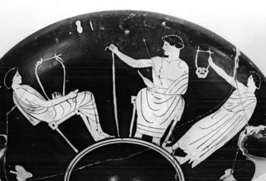 Keywords: Painter of London D 12 - Kylix with Woman and Music Lesson - Walters 4893 - Side A Detail.jpg This red-figure kylix depicts a woman standing to the left in the tondo She extends her right hand in which she holds a length of a wool that comes out of a kalathos on the ground before her Behind on the upper right hangs a mirror She wears a chiton mantle and fillet On the front side are three youths in a music lesson On the left a youth sits to the right on a diphros holding a barbiton upright on his lap with his left hand and a plectron in the right which is attached to the instrument by a string A bag hangs behind him An older youth in the center sits frontally on a diphros head to the left In his outstretched right hand he has a staff and in the left he holds a bag on his lap Between them hangs a pair of sandals one in profile the other shown from the bottom On the right another youth stands to the left holding out a lyre in his right hand; a plectron hangs from a string attached to the lyre All three wear a mantle and fillet On the back three youths are again depicted in a music lesson On the left a youth playing auloi sits on a diphros in profile to the right A pair of sandals hangs behind him as on the front In the center another youth stands in profile to the left A flute case and a bag hang between them On the right a third youth stands to the left holding out a lyre in his right hand; a plectron hangs from a string attached to it All three wear mantle and fillet ca 470 460 BC Classical terracotta H with handles 3 7/8 x Diam with handles 12 1/2 in 9 9 x 31 7 cm ; Diam at mouth cm 24 3 ; Diam at foot cm 9 7 accession number 48 93 19953 Don Marcello Massarenti Collection Rome 1897 cat no 241 Henry Walters city Baltimore Walters Art Museum Henry Walters Acquired by Henry Walters with the Massarenti Collection 1902 inscription place of origin Attica Greece Walters Art Museum license Ancient Greek red-figure pottery in the Walters Art Museum Painter of London D 12 Media contributed by the Walters Art Museum needs artist update Costume in ancient Greece Musical instruments of Greece Kylixes Music in ancient Greek pottery Music lessons in art |