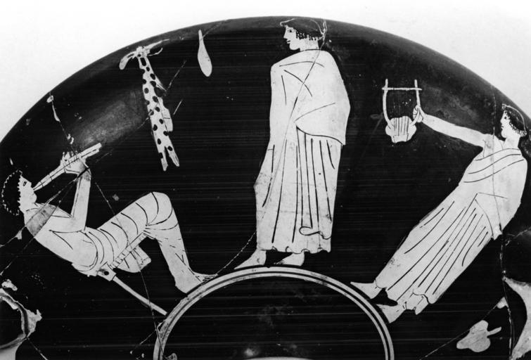 Keywords: Painter of London D 12 - Kylix with Woman and Music Lesson - Walters 4893 - Side B Detail.jpg This red-figure kylix depicts a woman standing to the left in the tondo She extends her right hand in which she holds a length of a wool that comes out of a kalathos on the ground before her Behind on the upper right hangs a mirror She wears a chiton mantle and fillet On the front side are three youths in a music lesson On the left a youth sits to the right on a diphros holding a barbiton upright on his lap with his left hand and a plectron in the right which is attached to the instrument by a string A bag hangs behind him An older youth in the center sits frontally on a diphros head to the left In his outstretched right hand he has a staff and in the left he holds a bag on his lap Between them hangs a pair of sandals one in profile the other shown from the bottom On the right another youth stands to the left holding out a lyre in his right hand; a plectron hangs from a string attached to the lyre All three wear a mantle and fillet On the back three youths are again depicted in a music lesson On the left a youth playing auloi sits on a diphros in profile to the right A pair of sandals hangs behind him as on the front In the center another youth stands in profile to the left A flute case and a bag hang between them On the right a third youth stands to the left holding out a lyre in his right hand; a plectron hangs from a string attached to it All three wear mantle and fillet ca 470 460 BC Classical terracotta H with handles 3 7/8 x Diam with handles 12 1/2 in 9 9 x 31 7 cm ; Diam at mouth cm 24 3 ; Diam at foot cm 9 7 accession number 48 93 19953 Don Marcello Massarenti Collection Rome 1897 cat no 241 Henry Walters city Baltimore Walters Art Museum Henry Walters Acquired by Henry Walters with the Massarenti Collection 1902 inscription place of origin Attica Greece Walters Art Museum license Ancient Greek red-figure pottery in the Walters Art Museum Painter of London D 12 Media contributed by the Walters Art Museum needs category review Media contributed by the Walters Art Museum needs artist update Kylixes Music lessons in art |