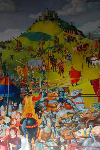 Keywords: painting knight battle conquest human image colorful color canvas dynasty house of hohenstaufen artists battle of vineyard vineyard house of welf sandra round image round image chapter hall monastery of lorch ride horses hans kloss mountain castle siege lances spears attack middle ages lorch hohenstaufen kingdom konrad iii the battle women free departure leave castle know true weibertreu