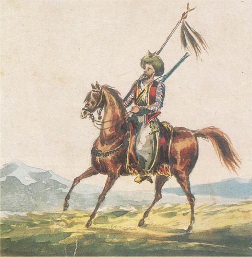 | Keywords: Paintings by Mikhail Lermontov, 1836.jpg A Mountaineer Horseman with a banner Конный го ец со знаменем 1836 Аква ель Ю Ле монтова из альбома Ле монтовой Публичная библиотека им Е Салтыкова-Щед ина Санкт-Пете бу г book Places connected with names of famous Russian writers источник Лите ату ные места России осква Издательство Советская Россия 1987 1836 Creator Mikhail Lermontov Paintings by Mikhail Lermontov Horses in art of Russia PD-old-100 | ||||