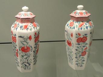 Keywords: Pair of Hexagonal Vases, c. 1752-1755, Chelsea, soft-paste porcelain with overglaze enamels - Gardiner Museum, Toronto - DSC00614.JPG Exhibit in the Gardiner Museum Toronto Ontario Canada This artwork is in the public domain because the artist died more than 70 years ago Photography was permitted in the museum without restriction Daderot 2012-10-16 14 41 04 Daderot cc0 cc0 Chelsea porcelain in the Gardiner Museum Hexagonal vessels jars |