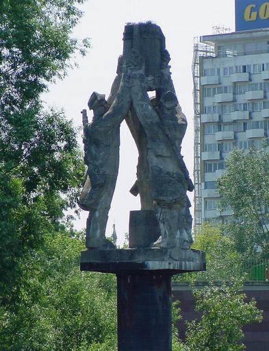Keywords: Pal Pomnika Saperów.jpg Pal z postaciami trzech saperów - jedna z części Pomnika Chwała Saperom w Warszawie Widok z nurtu Wisły Autor Piotr Biegała - HeAVenlY Chwała Saperom Monument in Warsaw