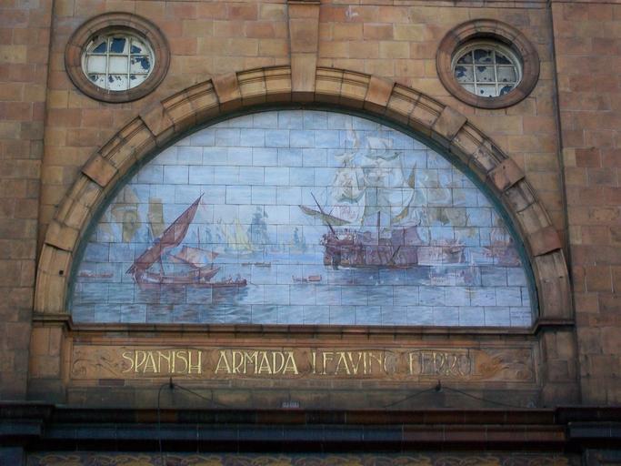 Keywords: Tile panel by Doulton after Sir Oswald Brierley.The Spanish Armada leaving Ferrol