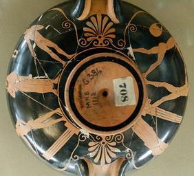 Keywords: Palaestra scenes Louvre G384.jpg Painter of London E 80 Palaestra scenes javelin throw and boxing Attic red-figure cup ca 470 BC Found in Vulci Scènes de palestre lancer du javelot et pugilat Coupe attique à figures rouges vers 470 av J -C Provenance Vulci H 8 2 cm 3 in 23 1 cm 9 in W 30 cm 11 ¾ in Museum Louvre Department of Greek Etruscan and Roman Antiquities Sully first floor room 39 case 9 object history credit line Paravey Collection; purchase 1879 accession number G 384 Jastrow 2007 other versions <gallery> Image Javelin thrower Louvre G384 jpg Detail javelin thrower Image Boxing scene Louvre G384 jpg Detail boxing scene </gallery> Ancient Greek pottery from Vulci Ancient sports Painter of London E 80 Paravey Collection Greek antiquities in the Louvre - Room 39 Kylixes Athletes in ancient Greek pottery 470s BC pottery in France Paris |