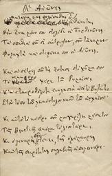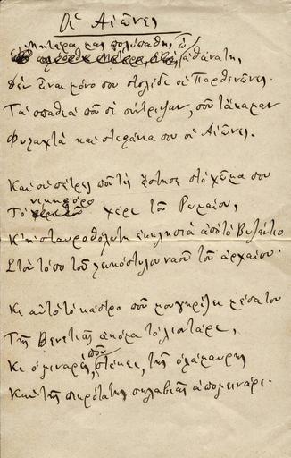 | Keywords: Palamas-hoi-aiones.jpg en The handrwritten three first stanzas of the poem Hoi aiones written by the Greek poet Kostis Palamas 1859-1943 el Χειρόγραφο με τις τρεις ρώτες στροφές του οιήματος «Οἱ αἰῶνες» του Έλληνα οιητή Κωστή Παλαμά 1859-1943 First published in 1896 in the Athenian newspaper To Asty www vergosauctions com Kostis Palamas 1859-1943 other versions PD-old-70-1923 Kostis Palamas | ||||
