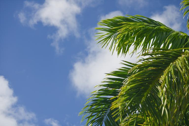Keywords: palm frond sky blue clouds green plant tree wind tropic summer holiday vacation