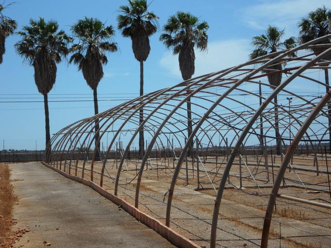 Keywords: palm trees old greenhouses greenhouses old empty abandoned frame linkage leave landscape agriculture cultivation greenhouse