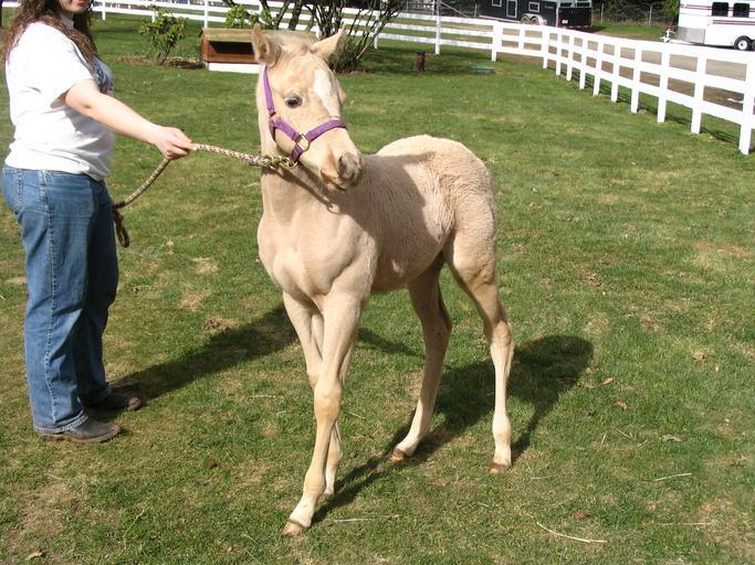 | Keywords: horses palomino colt outdoor animal In this picture the colt, named Bear, is about two months old. He is accompanied by a stablehand holding his lead. CC0 waiver: To the extent possible under law, I waive all copyright and related or neighboring rights to this work. In this picture the colt, named Bear, is about two months old. He is accompanied by a stablehand holding his lead. CC0 waiver: To the extent possible under law, I waive all copyright and related or neighboring rights to this work. |