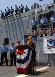 | Keywords: Pamela Anderson USS Halsey.jpg 050802-N-0685S-006 San Diego Calif Aug 02 2005 - Actress Pamela Anderson thanks the crew of the guided-missile destroyer USS Halsey DDG 97 for their service to the country Anderson visited the newly-commissioned ship to present the USO with a 150 000 donation from Fox Home Entertainment in commemoration of the historic World War II event VJ Day U S Navy Photo by Photographer's Mate 3rd Class Jo A Wilbourn Sims RELEASED from http //www navy mil/view_image asp id 26873 PD-USGov-Military-Navy Pamela Anderson USS Halsey DDG-97 Ship nameplates |