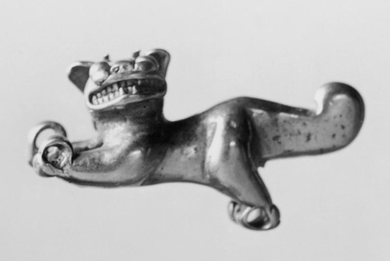 | Keywords: Panamanian - Horned Jaguar Pendant - Walters 57266 - Group.jpg Pendants were worn by men around the neck on ceremonial occasions Columbus noted that the inhabitants of Panama who came to greet him wore gold pendants in the shape of eagles This piece could have been created in Columbus's time or during the previous 600 years This pendant represents a jaguar with which a warrior would have wanted to associate The head of the animal is turned aside as if to observe a potential viewer or enemy On each foot is a ring for suspension between 800 1521 Pre-Early Conquest gold and copper alloy cm 2 5 4 9 accession number 57 266 33285 Found at a graveyard between Divalá a village on the outskirts of settled Panama thirty miles west of David in the province of Chiriqui and Costa Rica Spring 1909 Tiffany Co New York 1910 by purchase from Indians see December 29 1910 correspondance from Tiffany Co to Henry Walters Henry Walters city Baltimore Walters Art Museum Henry Walters Acquired by Henry Walters 1911 place of origin Veraguas-Gran Chiriquí in present-day Panama Walters Art Museum license Pre-Columbian art in the Walters Art Museum Pre-Columbian metalwork of Panama Media contributed by the Walters Art Museum needs category review Pre-Columbian jaguar pendants Jaguars in art of Panama |