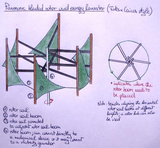 | Keywords: Panemone bladed rotor WECS (Turks&Caicos).JPG en A schematic of a Panemone bladed rotor wind energy harvester as commonly built in the Turks Caicos islands The schematic was hand drawn based on an image at http //www fao org/docrep/010/ah810e/AH810E10 htm Own KVDP 2009-09-23 Sustainable development Panemone windmills Micro-generation wind turbines |