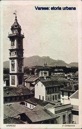 | Keywords: Vista sul campanile ed il tiburio di San Vittore (entrambe opere dell' arch. Giuseppe Bernasconi). In secondo piano, a destra del tiburio, villa Mylius sul colle Miogni. In primo piano destra, l'edificio multipiano era l'antico palazzo arcivescovile (citato per la prima volta nel 1179) costruito dietro il battistero di San Giovanni Battista, abbattuto negli anni '60 per realizzare la sede di un istituto bancario (la ex Banca Popolare di Luino e di Varese). varese | ||||
