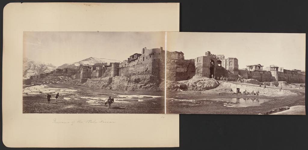 | Keywords: Panorama of the Bala Hissar WDL11486.png Artwork ru Бе к Джон уме в 1900 году fr Burke John mort en 1900 en Burke John died 1900 zh 约翰·伯克,卒于 1900 年 pt Burke John falecido em 1900 ar بيرك، جون، توفي 1900 es Burke John fallecido en 1900 ru Пано амный снимок к епости Бала-Хисса fr Panorama de Bala Hissar en Panorama of the Bala Hissar zh 巴拉希萨尔全景 pt Panorama de Bala Hissar ar لقطة بانورامية لبالا حصار ru Эта пано амная фотог афия к епости Бала-Хисса Высокая к епость в Кабуле входит в альбом едких исто ических фотоснимков на кото ых изоб ажены люди и места связанные со Вто ой англо-афганской войной В сентяб е 1879 года в к епости п оизошло убийство б итанского дипломатического п едставителя в Кабуле сэ а Пье а Луи аполеона Каванья и 1841 1879 гг сп овоци овавшее всеобщее восстание и начало вто ого этапа войны Позади к епости высится го а Кох-и-Ше -Да ваза львиная две ь а по обеим сто онам вдаль уходят д евние стены с бойницами и сто ожевыми башнями Эта к епость ведущая свою исто ию с пятого века возвышалась над го одом с асположенного к югу от него холма и т адиционно была езиденцией афганских п авителей Считается что она была местом жительства Тиму а Таме лана от Tīmūr Lang что означает Тиму Х омой и Бабу а импе ато а Великих онголов Возле входных во от в п авой части снимка видны б итанские войска Вто ая англо-афганская война началась в нояб е 1878 года когда Великоб итания опасаясь как ей казалось астущего влияния России в Афганистане вто глась в эту ст ану с те ито ии Б итанской Индии Пе вый этап войны закончился в мае 1879 года подписанием Гандамакского догово а позволившего афганцам сох анить внут енний суве енитет однако заставившего их уступить конт оль над внешней политикой своей ст аны б итанцам Военные действия возобновились в сентяб е 1879 года после антиб итанского восстания в Кабуле и окончательно заве шились в сентяб е 1880 года ешающей битвой за Кандага Данный альбом включает по т еты б итанских и афганских лиде ов и военнослужащих фотог афии п остых афганских людей изоб ажения б итанских военных лаге ей военных действий ст оений пейзажей к упных и небольших го одов Все изоб аженные на фотоснимках места находятся на те ито ии сов еменных Афганистана или Пакистана в то в емя бывших частью Б итанской Индии Около т ети п едставленных в альбоме фотог афий выполнены Джоном Бе ком около 1843 1900 гг д угая т еть сэ ом Бенджамином Симпсоном 1831 1923 гг а оставшаяся часть несколькими д угими фотог афами Авто ы некото ых фотоснимков неизвестны Возможно что составителем альбома был один из членов б итанского п авительства в Индии однако это п едположение не подтве ждено Каким об азом альбом попал в Библиотеку Конг есса неизвестно <br>Афганские войны; К епости и фо тификационные соо ужения; Го ы; Пано амные фотог афии fr Cette vue panoramique de Bala Hissar fort élevé à Kaboul est extraite d'un album de photographies historiques rares de personnalités et de sites associés à la seconde guerre anglo-afghane L'envoyé britannique à Kaboul sir Pierre Louis Napoléon Cavagnari 1841 1879 fut assassiné dans le fort en septembre 1879 déclenchant un soulèvement général et la seconde phase de la guerre Sur la photographie la montagne Kōh-e Shēr Darwāzah porte du lion s'élève derrière le fort tandis que les murs anciens fortifiés et dotés de tours de sentinelle disparaissent progressivement au loin des deux côtés La forteresse qui date du V<sup>e</sup> siècle dominait la ville depuis le sommet d'une colline au sud et elle fut le siège traditionnel des souverains afghans Elle fut vraisemblablement la résidence de Tamerlan ou Tīmūr Lang qui signifie Timour le boiteux et de l'empereur moghol Bâbur Les troupes britanniques sont visibles près de l'entrée dans la partie droite de la photographie La seconde guerre anglo-afghane commença en novembre 1878 lorsque la Grande-Bretagne se sentant menacée par l'influence croissante des Russes en Afghanistan envahit le pays depuis l'Inde britannique La première ph