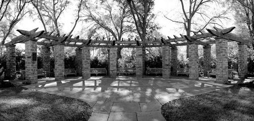 Keywords: panorama panoramic bench benches park bench columns garden pillar black and white