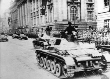 Keywords: Panzer III Ausf A in Berlin c1938.jpg Early pre-production German Panzer III Ausf A tanks during a parade in Berlin The tank in front of the Ausf A is an Ausf B <br> Original caption Berlin Germany c 1938 German medium tanks Mark III Sd Kfz 141 parading past Adolf Hitler and a crowd of servicemen and civilians Note the Nazi flags flying from the buildings P02188 006 Original print held in AWM Archive Store c 1938 not stated Image copyright Copyright expired - public domain frame cropped PD-Australia 52 31 2 437748 N 13 23 34 101791 W Panzerkampfwagen III during World War II Staatsbibliothek zu Berlin Unter den Linden Unter den Linden Black and white photographs of Germany in the 1930s |