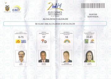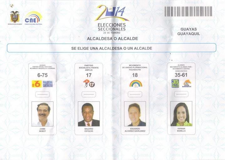 View Original: | Papeleta de votación de las Elecciones municipales de Guayaquil de 2014 para alcaldes.jpg (960x685) | |||