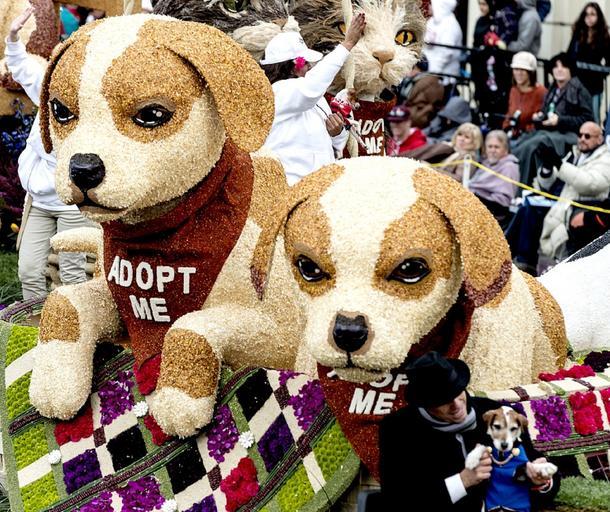 Keywords: parade float dogs floral rose parade street colorful flower crowds event pasadena beverly hills california usa