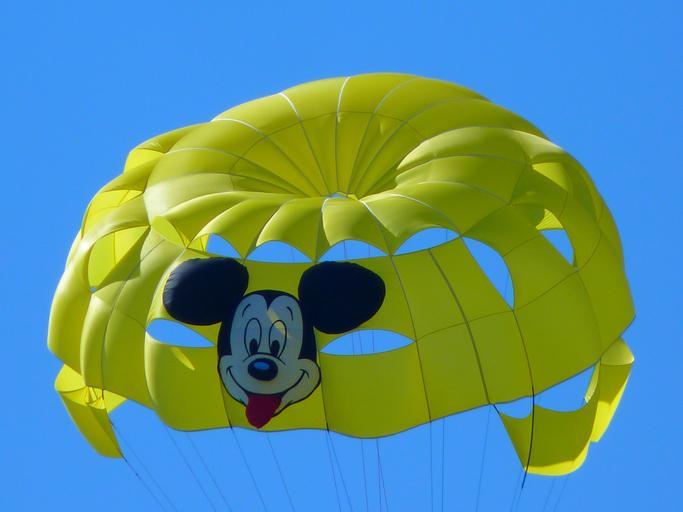 Keywords: parasailing controllable parachuting parachute fly bird's eye view paragliding hang gliding sky blue neon yellow mickey mouse