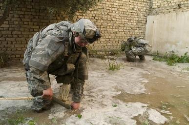 Keywords: Paratroopers make progress against insurgents in Adhamiyah DVIDS40372.jpg en Spc Wesley Van der Velde of Provincetown Ill left and Spc Marcus Tiller of Daytona Fla right paratroopers with A Company 325th Special Troops Battalion 2nd Brigade Combat Team 82nd Airborne Division search for a hidden weapons cache at a suspected insurgent's house in Adhamiyah March 22 A car bomb had destroyed the house and flooded it with water from a broken main turning the search area into a muddy soup 2007-03-22 Staff Sgt Michael Pryor https //www dvidshub net/image/40372 40372 2007-04-03 10 41 BAGHDAD IQ PD-USGov 82nd Airborne Division Images from DoD uploaded by Fæ |