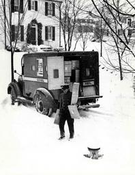 | Keywords: smithsonian institution smithsonianinstitution parcel package post mail mailman postman post van postvan mail order mailorder snow winter u.s. mail usmail commons:collection=mail usps uniform 1950s uniforms national postal museum nationalpostalmuseum mail across the commons mailacrossthecommons monochrome blackandwhite black and white Description: City carrier delivering packages in the snow. The carrier's vehicle was designated to carry parcels only, not letter mail. By 1949, the post-World War II boom pushed mail volumes to unprecedented heights. A large part of the increase was in parcels, as growing families looked to mail order catalogs for more and more of their household goods. Before city carriers were assigned vehicles to carry both parcel and letter mail at the same time, parcel post deliveries were made separately. Creator/Photographer: Unidentified photographer Medium: Black and white photographic print Culture: American Geography: USA Date: c. 1950 Persistent URL: arago.si.edu/index.asp?con=2&cmd=1&id=203577 Repository: National Postal Museum Collection: U.S. Mail Trucks Accession number: A.2008-50 Description: City carrier delivering packages in the snow. The carrier's vehicle was designated to carry parcels only, not letter mail. By 1949, the post-World War II boom pushed mail volumes to unprecedented heights. A large part of the increase was in parcels, as growing families looked to mail order catalogs for more and more of their household goods. Before city carriers were assigned vehicles to carry both parcel and letter mail at the same time, parcel post deliveries were made separately. Creator/Photographer: Unidentified photographer Medium: Black and white photographic print Culture: American Geography: USA Date: c. 1950 Persistent URL: arago.si.edu/index.asp?con=2&cmd=1&id=203577 Repository: National Postal Museum Collection: U.S. Mail Trucks Accession number: A.2008-50 |