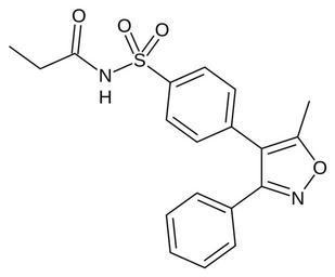 Keywords: Parecoxib.svg Structural diagram of parecoxib Created using http //www acdlabs com/download/chemsk html ACD/ChemSketch 10 0 and Inkscape Own 2007-01-01 Fvasconcellos COX-2 inhibitors Isoxazoles Prodrugs