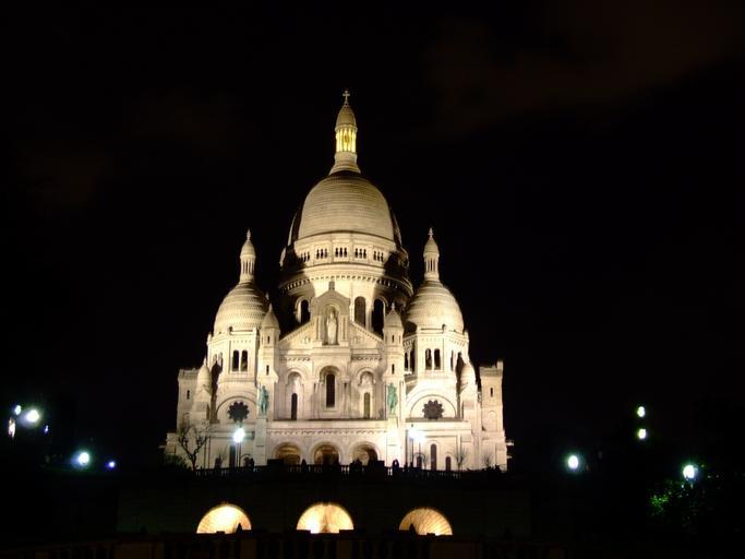 Keywords: paris france night evening basilique du sacre coeur church cathedral lights lighting landmark historical dome spires architecture