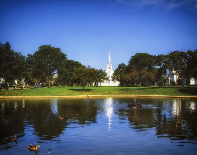 Keywords: park pond cohasset massachusetts common water ducks church trees summer nature outside landscape scenic sky clouds reflections
