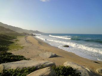 Keywords: parque tayrona beach santa martha sea rest unaffected nature wave spray plant green colombia south america nature conservation national park sand wind blue sky sun mountains distant wide view overview endless stones