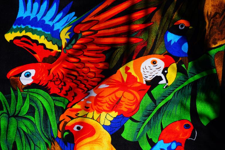Keywords: parrots aras lori parakeet birds towel bath towel colorful color bench towel terry terry cloth fabric