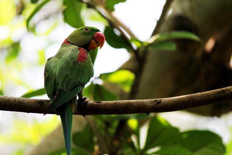 Keywords: parrots birds forests greenery plumage feathers red beak exotic tropical colorful wildlife sitting trees branches leaves background flora fauna single alone isolated