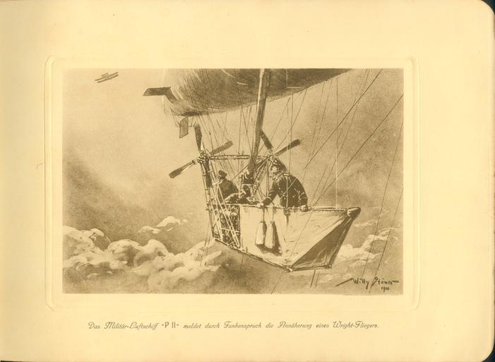 Keywords: Parseval-Broschuere-E1.png extract image Gemälde der Gondel des Parseval-Luftschiffes PL3/PII Willy Stöwer's painting of the gondola of the PL3/P II reporting arrival of a Wright flyer Caption translated The miltary airship - P II - reports by radio the approach of a Wright flyer Broschuere der Luftfahrzeug-GmbH Berlin Parseval aus dem Nachlass von Theodor Kiefer Chefingenieur bei Parseval 1910 Willy Stöwer 1864-1931 bekannter Marinemaler author died more than 70 years ago PD-old File Parseval PL3 PII ILA 1909 jpg en Over ILA 1909 at Frankfurt am Main From the Jean-Pierre Lauwers collection ImageNote 1 248 192 90 45 1366 998 2 Wright Flyer ImageNoteEnd 1 Airship gondolas 1910 before Parseval airships PL3 Willy Stöwer Wright Flyer |
