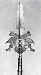 | Keywords: Partisane Sachsen 1.H. 18.Jh.jpg de Stangenwaffe mit Doppeladler als Ohren strernförmig durchbrochener Rosette und einer breiten geflammten zweischneidigen Stossklinge en polearm partisan with double eagle as ears starlike open-worked escutcheon with a broad double-edged mottled push-blade century 18 Hugo Schneider Eine Partisane aus der sächsischen Schweizergarde Jahresbericht / Schweizerisches Landesmuseum Zürich 1944 author other versions PD-old-100 Army of Saxony Swiss soldiers in foreign service Partisans weapons 18th-century weapons Double-headed eagles |