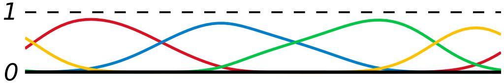 Keywords: Partition of unity illustration.svg Illustration of en Partition of unity self-made with MATLAB tweaked in Inkscape 03 38 9 August 2007 UTC Oleg Alexandrov Source code MATLAB <source lang Matlab > illustration of partitition of unity For simplicity we cheat by using scaled sums of gaussians instead of bump functions function main figure 1 ; clf; hold on; axis equal; axis off; lw 2; linewidth h 0 1; grid size endpoints of the interval a -5; b 10; Sample -2 1 -1 3 -0 4 1 3 1 8 3 1 4 5; red 0 867 0 06 0 14; blue 0 129 205/256; green 0 200 70/256; yellow 254 194 0/256; Colors red' blue' green' yellow; L 2 4 6 8; X a h b; Y zeros length L length X ; Yt 0 X; gaussian with mean zero variance zsigma zsigma 0 55; f inline 'exp -x 2/2/zsigma /zsigma/sqrt 2 pi ' ; pos 1; for i 1 length Sample if i > L pos pos pos+1; end Ycur f X-Sample i zsigma ; Y pos Y pos + Ycur; Yt Yt+Ycur; end Xtp Ytp make_periodic a b h X Yt ; Yr 0 Xtp; for pos 1 length L Xp Yp make_periodic a b h X Y pos ; Yp Yp /Ytp; Yr Yr + Yp; plot Xp Yp 'color' Colors pos 'linewidth' lw ; end plot Xtp 0 Yr 'k' 'linewidth' lw ; plot Xtp Yr 'k' 'linewidth' lw/1 4 'linestyle' '--' ; fs 20; shiftx -0 3; shifty -0 0; text Xtp 1 +shiftx 0+shifty '0' 'fontsize' fs ; text Xtp 1 +shiftx 1+shifty '1' 'fontsize' fs ; saveas gcf 'Partition_of_unity_illustration eps' 'psc2' ; plot2svg 'Partition_of_unity_illustration svg' ; function Xp Yp make_periodic a b h X Y Take a function defined on the real line Wrap the real line around Sum the overlapping parts Get a periodic function T 8; as -3; bs as+T; A as-a /h; B bs-a /h; N length Y ; Y B-A+1 B Y B-A+1 B + Y 1 A ; Y A+1 A+N-B Y A+1 A+N-B + Y B+1 N ; Yp Y A+1 B ; Xp X A+1 B ; </source> Differential geometry Images with Matlab source code Files by User Oleg Alexandrov from en wikipedia SVG mathematics |