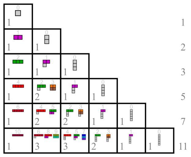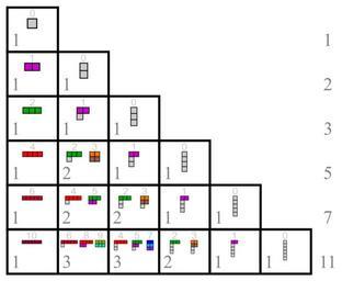 Keywords: Partitions of n with k addends.svg Illustration of the triangle A008284 <br> showing the number of partitions of n <small> top to bottom starting from 1 </small> with k <small> left to right starting from 1 </small> addends<br> The partitions are represented by Young diagrams <br> The row sums on the right are the partition numbers A000041 The big numbers in Times New Roman show the number of partitions in the respective box of the triangle <br> The small numbers in Arial show the index number of the partition below compare this table Compare <br> thumb left 300px With biggest addend k<br> reflected Young diagrams thumb right 300px Set partitions up to rotation and reflection own Mate2code Integer partitions Young diagrams Triangles of numbers Colored partitions violet green brown red |