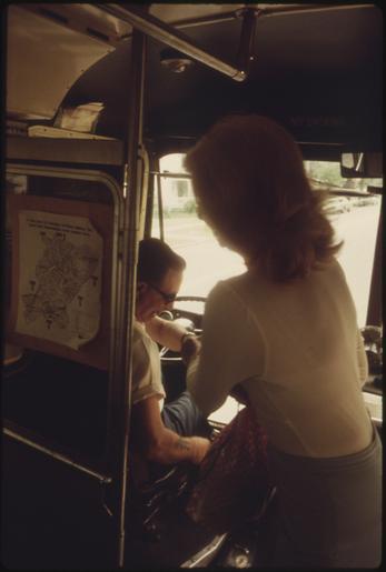 | Keywords: PASSENGER PAYING FARE AFTER BOARDING A DIAL A RIDE RADIO DISPATCHED DOOR-TO-DOOR BUS SERVICE AT HER HOME IN... - NARA - 556739.tif Scope and content General notes 556739 Local identifier 412-DA-14287 Environmental Protection Agency 12/02/1970 - NARA-Author Pickerell Jim 1936- Photographer 4588217 <br /> Haddonfield Camden county New Jersey United States North and Central America inhabited place 3354430 39 883 -75 033 <br /> Still Picture Records Section Special Media Archives Services Division NWCS-S National Archives at College Park 8601 Adelphi Road College Park MD 20740-6001 05/1974 Record group Record Group 412 Records of the Environmental Protection Agency 1944 - 2006 Record group ARC 708 DOCUMERICA The Environmental Protection Agency's Program to Photographically Document Subjects of Environmental Concern compiled 1972 - 1977 Series ARC 542493 File unit File unit ARC Variant control numbers Agency-Assigned Identifier 239/07/014287<br /> NAIL Control Number NWDNS-412-DA-14287 yes Other versions <gallery> File PASSENGER_PAYING_FARE_AFTER_BOARDING_A_DIAL_A_RIDE_RADIO_DISPATCHED_DOOR-TO-DOOR_BUS_SERVICE_AT_HER_HOME_IN _-_NARA_-_556739 tif tif File PASSENGER_PAYING_FARE_AFTER_BOARDING_A_DIAL_A_RIDE_RADIO_DISPATCHED_DOOR-TO-DOOR_BUS_SERVICE_AT_HER_HOME_IN _-_NARA_-_556739 jpg jpg </gallery> NARA-cooperation PD-USGov Bus drivers in New Jersey Bus interiors in New Jersey Bus passengers in New Jersey NARA TIF images with categorized JPGs |