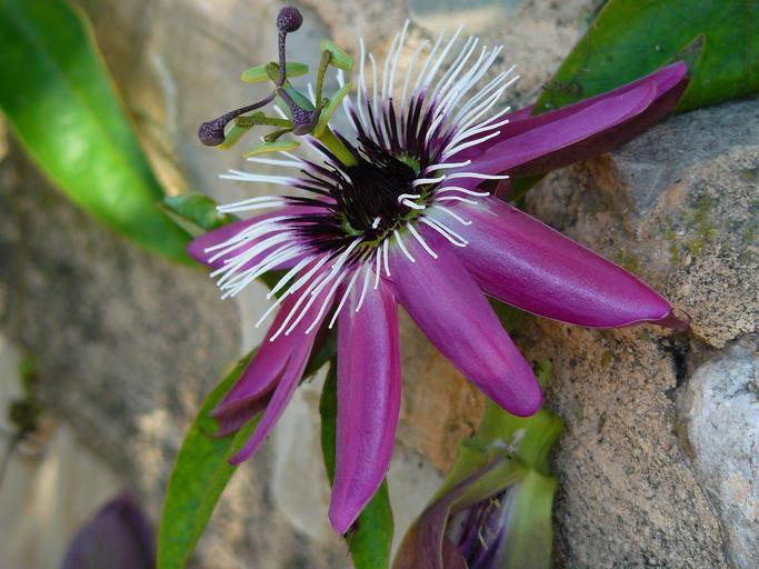 Keywords: passion flower flower blossom bloom bloom plant purple exotic summer flowers macro garden close flora botany ornamental plant farbenpracht beauty blossomed stone wall masonry hauswand decorative