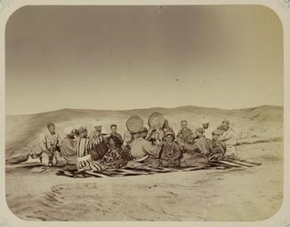 | Keywords: Pastimes of Central Asians. Group of Male Musicians Posing with Several Batchas, or Dancing Boys WDL10830.png Artwork ru Кун Александ Людвигович 1840 1888 гг fr Kun Aleksandr L 1840-1888 en Kun Aleksandr L 1840-1888 zh 亚历山大·L· ,1840-1888 年 pt Kun Aleksandr L 1840-1888 ar كُن، ألكسندر ل ، 1840-1888 es Kun Aleksandr L 1840-1888 ru Развлечения жителей С едней Азии Г уппа мужчин-музыкантов пози ующих с несколькими батчами или танцующими мальчиками fr Passe-temps des populations d'Asie Centrale Groupe de musiciens posant avec plusieurs batchas ou danseurs en Pastimes of Central Asians Group of Male Musicians Posing with Several Batchas or Dancing Boys zh 中亚人的娱乐活动: 群男乐师正 与几位 巴查 (跳舞的男孩) 起摆姿势 pt Passatempos dos povos da Ásia Central Grupo de músicos posando com vários batchas ou meninos dançarinos ar وسائل الترفيه لدى سكان وسط آسيا مجموعة من الموسيقيين الذكور يقفون للتصوير مع عدد من الباتشا أو الصبية الراقصين ru Эта фотог афия входит в этног афическую часть <em> Ту кестанского альбома </em><em></em> всесто оннего исследования Цент альной Азии п едп инятого после того как в 1860-х годах в егионе установилось господство Российской импе ии Альбом созданный по аспо яжению гене ала Константина Пет овича фон Кауфмана 1818 1882 годы пе вого гене ал-губе нато а оссийского Ту кестана состоит из четы ех частей в шести томах «Часть а хеологическая» два тома «Часть этног афическая» два тома «Часть п омысловая» один том и «Часть исто ическая» один том Основным составителем альбома был оссийский востоковед Александ Людвигович Кун аботавший совместно с иколаем Венедиктовичем Богаевским В альбоме п едставлено около 1200 фотог афий а также а хитекту ные планы аква ельные исунки и ка ты «Часть этног афическая» включает в себя 491отдельную фотог афию на 163 листах а фотог афиях изоб ажены п едставители азличных на одов егиона листы 1 33 повседневная жизнь и итуалы листы 34 91 а также виды де евень и го одов уличные то говцы и комме ческая деятельность листы 92 163 <br>Танцо ы; Ба абаны; А тисты; Этног афические фотог афии; Г упповые по т еты; авы и обычаи; узыкальные инст ументы; узыканты; Фотог афические исследования; По т етные фотог афии; Тю кские на оды fr Cette photographie est extraite de la partie ethnographique de l'<em>Album du Turkestan</em> étude visuelle complète de l'Asie centrale entreprise après que l'Empire russe prit le contrôle de la région dans les années 1860 Commandé par le général Konstantin Petrovich von Kaufman 1818 1882 premier gouverneur général du Turkestan russe l'album est composé de six volumes en quatre parties la partie archéologique deux volumes la partie ethnologique deux volumes la partie sur les métiers un volume et la partie historique un volume L'album fut essentiellement compilé par l'orientaliste russe Aleksandr L Kun assisté de Nikolai V Bogaevskii Il comporte près de 1200 photographies et inclut également des plans architecturaux des dessins à l'aquarelle et des cartes La partie ethnographique compte 491 photographies sur 163 planches montrant des individus des différentes peuplades de la région planches 1 à 33 des scènes de la vie quotidienne et des rites planches 34 à 91 ainsi que des vues de villages et de villes de vendeurs ambulants et d'activités commerciales planches 92 à 163 <br>Danseurs; Tambours; Artistes; Photographies ethnographiques; Portraits de groupe; Mœurs et coutumes; Instruments de musique; Musiciens; Inventaires photographiques; Portraits photographiques; Peuples turciques en This photograph is from the ethnographical part of <em>Turkestan Album</em><em> </em>a comprehensive visual survey of Central Asia undertaken after imperial Russia assumed control of the region in the 1860s Commissioned by General Konstantin Petrovich von Kaufman 1818 82 the first governor-general of Russian Turkestan the album is in four parts spanning six volumes Archaeological Part two volumes ; Ethnographic Part two volumes ; Trades Part one volume ; and Historical Part one volume The principal compiler was Russian Orientalist Aleksandr L Kun who was assisted by Nikolai V Bogaevskii The album contains some 1 200 photographs along with architectural plans watercolor drawings and maps The Ethnographic Part includes 491 individual photographs on 163 plates The photographs show individuals representing the different peoples of the region Plates 1 33 ; daily life and rituals Plates 34 91 ; and views of villages and cities street vendors and commercial activities Plates 92 163 <br>Dancers; Drums; Entertainers; Ethnographic photographs; Group portraits; Manners and customs; Musical instruments; Musicians; Photographic surveys; Portrait photographs; Turkic peoples zh 这张照片出自<em> 其斯 